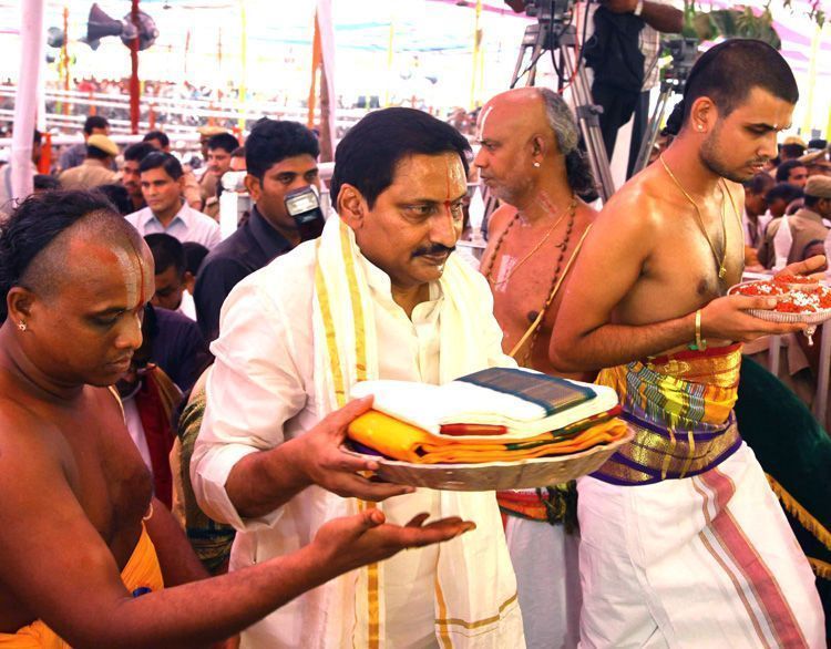 Chief Minister N.Kiran Kumar Reddy carrying 'Pattu Vastram and Pearls' on behalf of state government to present the Lord on the occassion of Sri Seetharama Kalyanam held in Bhadrachalam devasthanam on Sunday.