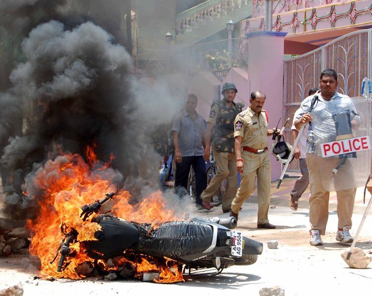 Old City tense: Communal roits erupted in some parts of Old City of Hyderabad on Sunday. Passersby suffer injuries after being hit by miscreants in the Madannapet and Saidabad on Sunday. Vehicles were damaged and set ablaze by the miscreants - INN Photos