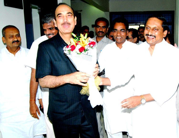 Chief Minister N.Kiran Kumar Reddy offering a bouquet to Union Health Minister and Incharge of party affairs in AP Ghulam Nabi Azad when he arrives at CM's camp office at Begumpet here on Sunday.