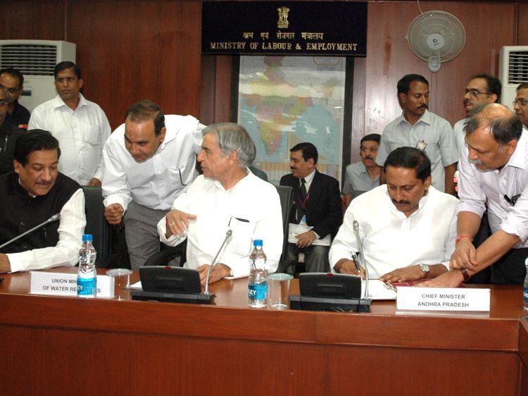Chief Minister N.Kiran Kumar Reddy signing the pacts with Maharashtra Government on the Pranahitha-Chevella Project in New Delhi on Saturday.