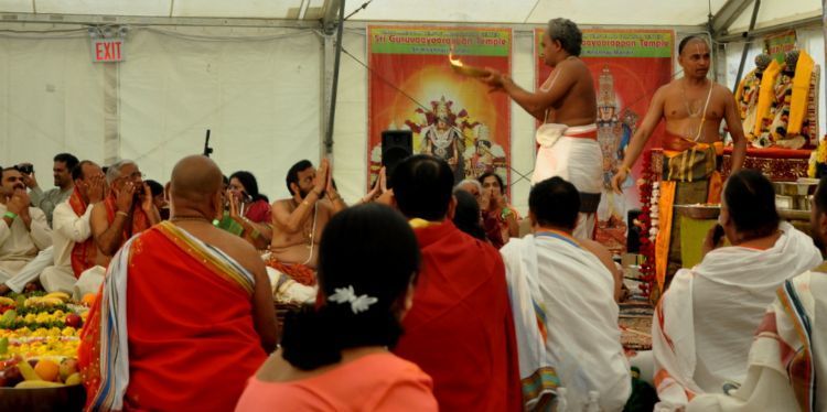 Telugu community, in huge number, turns up for Sri Srinivasa Kalyanam, performed with pomp and devotion, at Sri Guruvaayoorappan Temple in Morganville, NJ on Saturday. TTD chairman K.Bapi Raju along with chairman of Sri Guruvayoorappan Temple Mani Yegnasubramanian, PRO Dr. Prem Nandiwada took part in the event- Photos by Imam Nethrapalli
