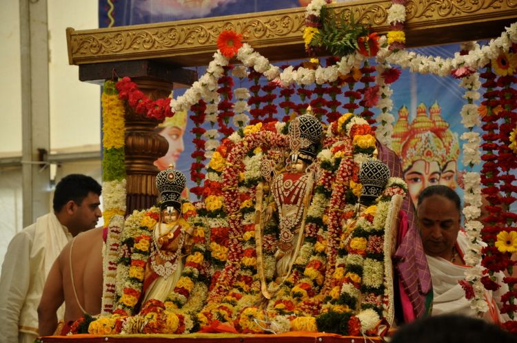 Telugu community, in huge number, turns up for Sri Srinivasa Kalyanam, performed with pomp and devotion, at Sri Guruvaayoorappan Temple in Morganville, NJ on Saturday. TTD chairman K.Bapi Raju along with chairman of Sri Guruvayoorappan Temple Mani Yegnasubramanian, PRO Dr. Prem Nandiwada took part in the event- Photos by Imam Nethrapalli