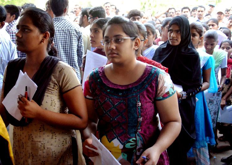 Students arriving at an examination center in Koti, Hyderabad to appear for Eamcet on Saturday.