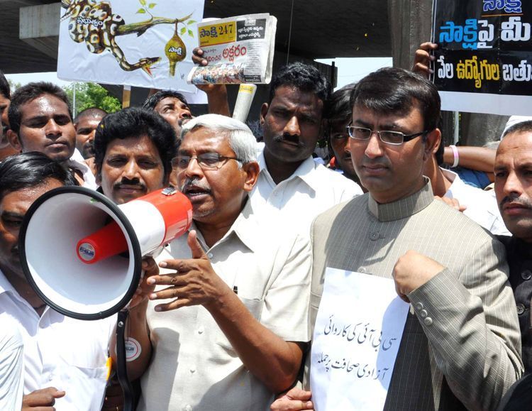 Telangana Political Joint Action Committee chairman Prof M Kodandaram takes part in the dharna at Tank Bund on Thursday protesting against freezing of Sakshi accounts by the CBI - INN Photos