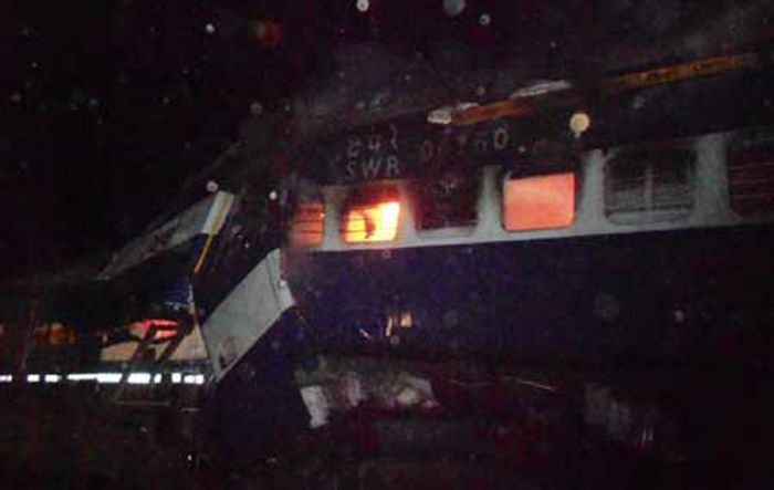 Rescue Operation: A view of the accident site near Penukonda railway station in Anantapur district where the Bangalore-bound Hampi Express rammed into a staionary goods train.