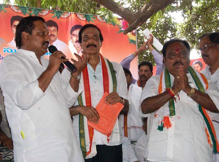Chief Minister N.Kiran Kumar Reddy speaking at a meeting during poll campaign in Tirupati on Wednesday. Also seen in the picture is Tirupati Congress candidate M.Venkataramana.
