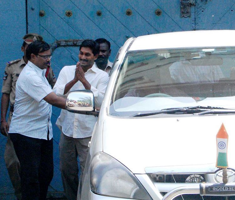YSR Congress party president Jaganmohan Reddy greets media persons and his supporters with folded hands while coming out of Chanchalguda Central Jail here on Sunday. Later, he was shifted to a guest house in the premises of the Director General of Prisons office where CBI officials will question him for the next five days - INN Photos