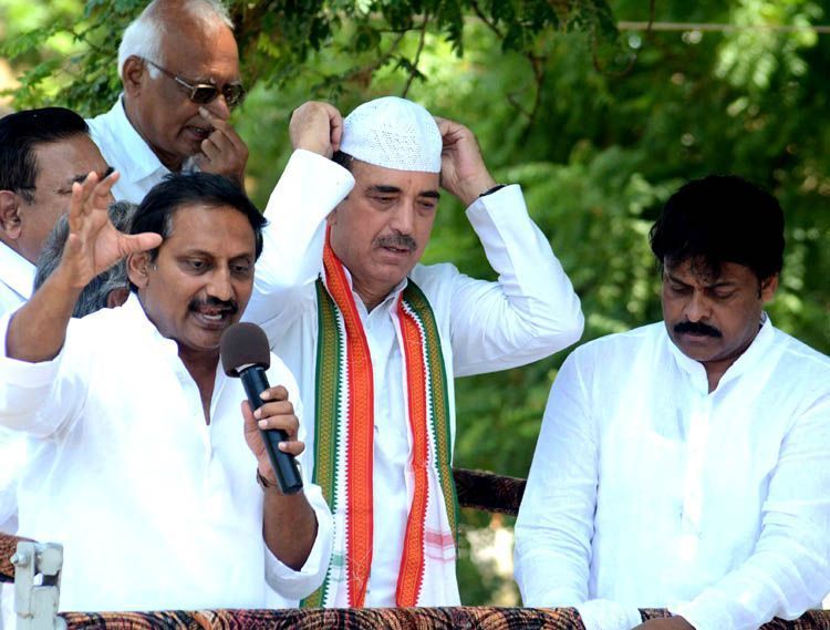 AICC general secretary Ghulam Nabi Azad, Chief Minister N.Kiran Kumar Reddy, Rajya Sabha member K Chiranjeevi during a road show in Allagadda on Tuesday.