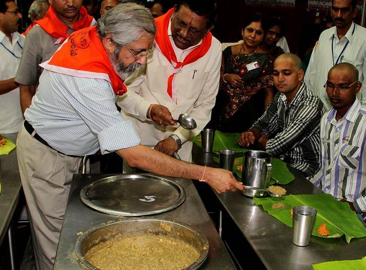 Supreme Court judge Justice Madan B. Lokur serving annaprasadam to the pilgrims in the Matrusri Tarigonda Vengamamba Annaprasadam Complex in Tirumala on Wednesday.