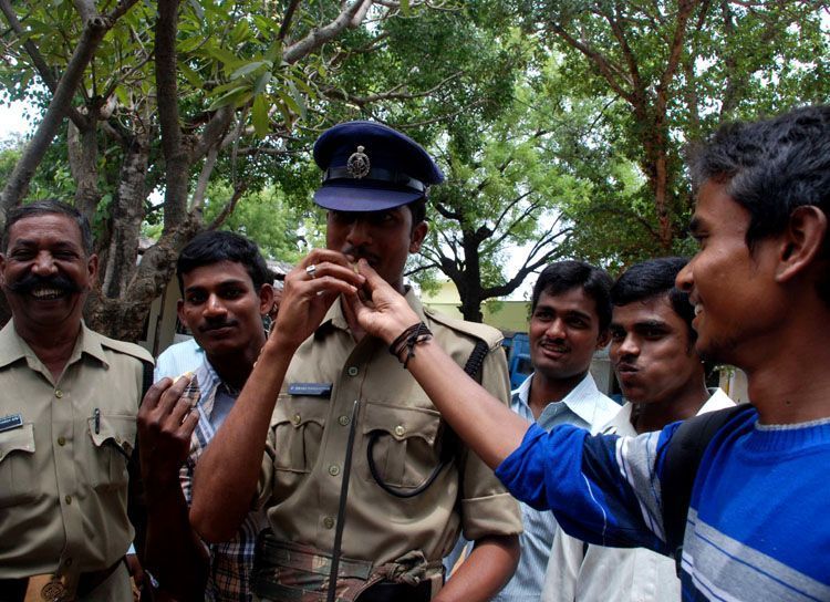 Sakshi reporters distributing sweets among journalists and security personel after the announcement of by-polls results at Chanchalguda Central Jail here on Friday - INN Photos