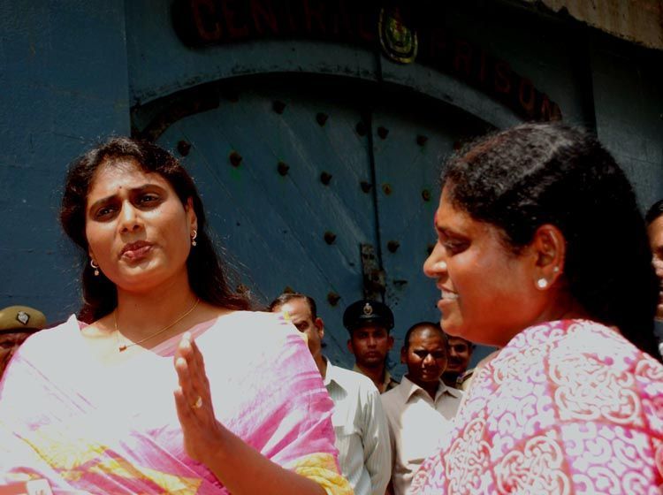 YS Jagan Mohan Reddy's mother Vijayamma and sister Sharmila in a jubiliant mood after meeting him at Chanchalguda Central Jail soon after the announcement of by-polls results on Friday - INN Photos