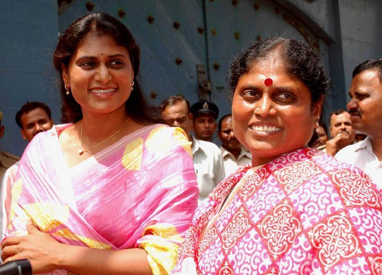 YS Jagan Mohan Reddy's mother Vijayamma and sister Sharmila in a jubiliant mood after meeting him at Chanchalguda Central Jail soon after the announcement of by-polls results on Friday - INN Photos