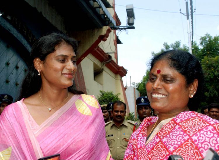YS Jagan Mohan Reddy's mother Vijayamma and sister Sharmila in a jubiliant mood after meeting him at Chanchalguda Central Jail soon after the announcement of by-polls results on Friday - INN Photos