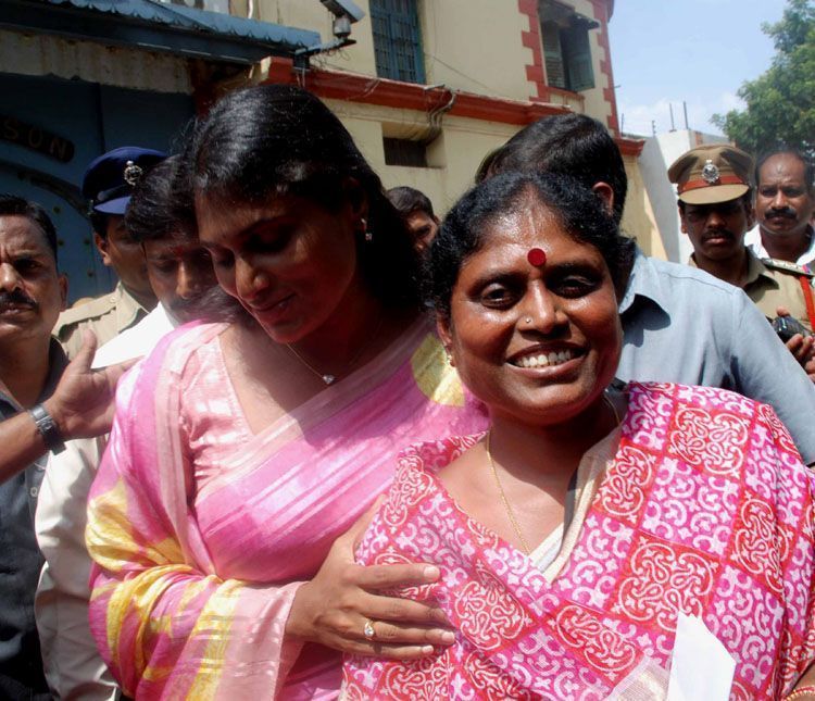 YS Jagan Mohan Reddy's mother Vijayamma and sister Sharmila in a jubiliant mood after meeting him at Chanchalguda Central Jail soon after the announcement of by-polls results on Friday - INN Photos