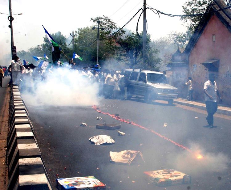 YSR Congress activists celebrate their party's victory on the streets of State capital here on Friday. Police prevented the activists from visiting the Chanchalguda Central Jail by erecting barricades - INN Photos