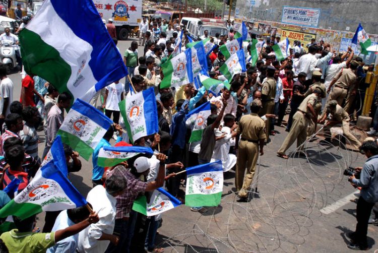YSR Congress activists celebrate their party's victory on the streets of State capital here on Friday. Police prevented the activists from visiting the Chanchalguda Central Jail by erecting barricades - INN Photos