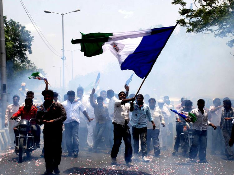 YSR Congress activists celebrate their party's victory on the streets of State capital here on Friday. Police prevented the activists from visiting the Chanchalguda Central Jail by erecting barricades - INN Photos