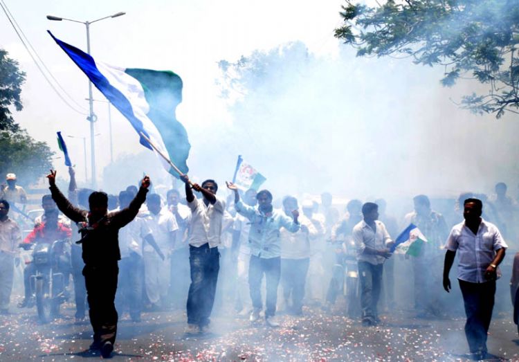 YSR Congress activists celebrate their party's victory on the streets of State capital here on Friday. Police prevented the activists from visiting the Chanchalguda Central Jail by erecting barricades - INN Photos
