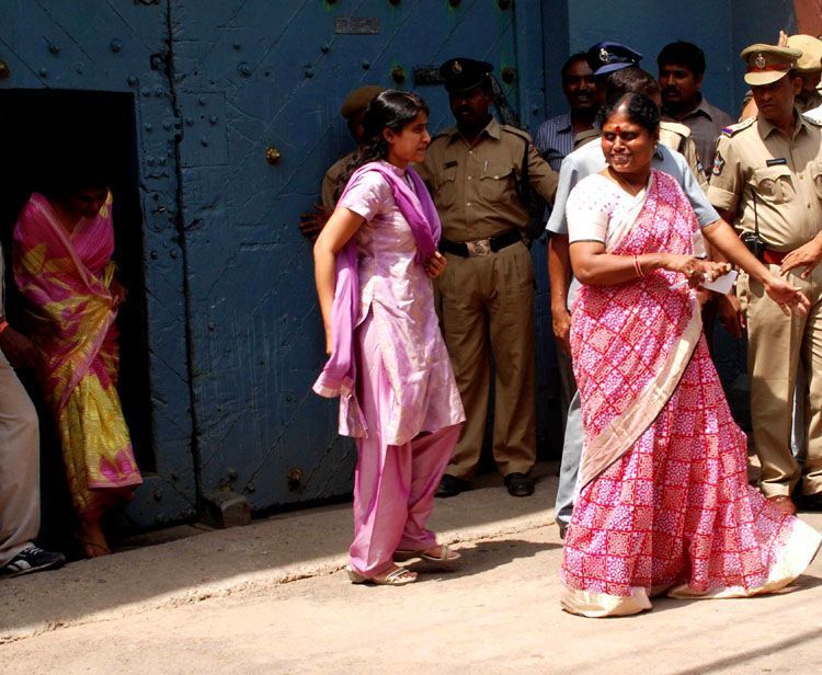 YS Jagan Mohan Reddys mother Vijayamma, sister Sharmila and wife Bharati coming coming out from Chanchalguda jail after having a Mulaqat on Friday.