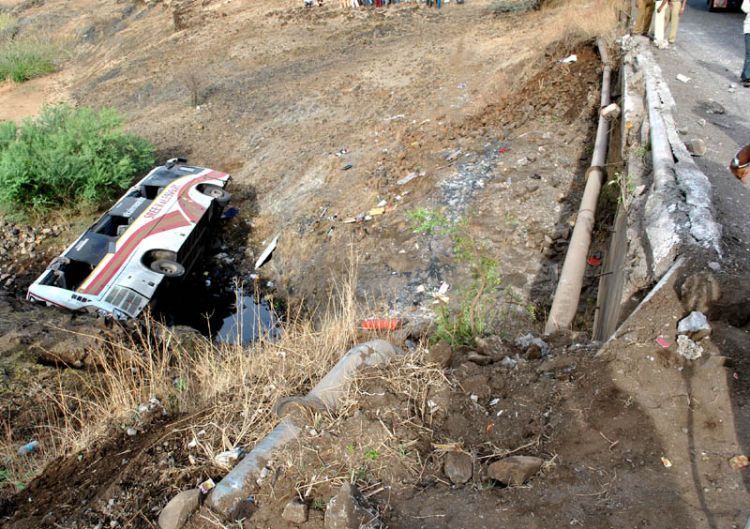 The wrecked bus lies on the ground after it plunged off a bridge in Osmanabad district in Maharashtra while on its way to Shirdi from Hyderabad during the wee hours of Saturday killing 32 passengers.