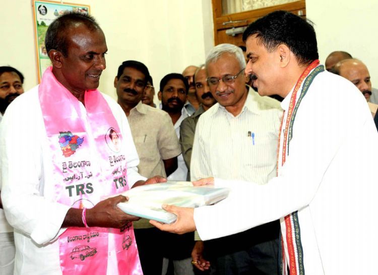 Newly elected MLAs Kothapalli Subbarayudu of Narsapuram (Congress) and M Bhikshapati of Parkal (TRS) takes oath in Speaker Nadendla Manohar's chambers here on Monday - INN Photos