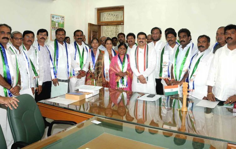 Newly elected YSR Congress MLAs along with Speaker Nadendla Manohar and party honorary president YS Vijaya Lakshmi after taking oath of office at Speaker's chamber on Friday - INN Photos