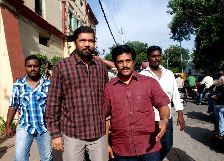 Noted film writer turned actor Posani Krishna Murali coming out of Chanchalguda jail after meeting former minister Mopidevi Venkatramana Rao on Tuesday.