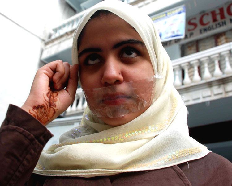A girl student of Sam British School is gagged with cello tape by her teacher as a punishment at Noor Khan Bazar in Hyderabad- INN Photos