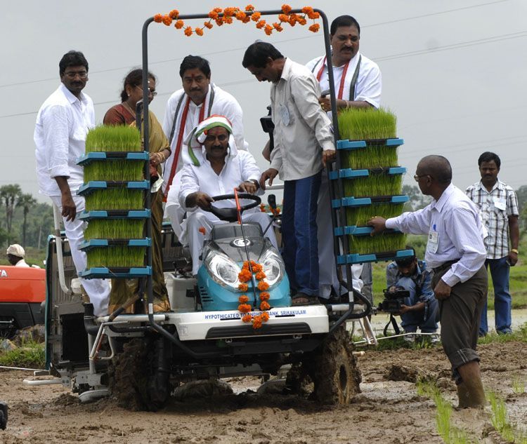Chief Minister N.Kiran Kumar Reddy trying his hand on mechanical paddy plantation machine in a field at Seethampeta in Srikakulam district on Friday during his three day Indiramma Baata tour of the district.