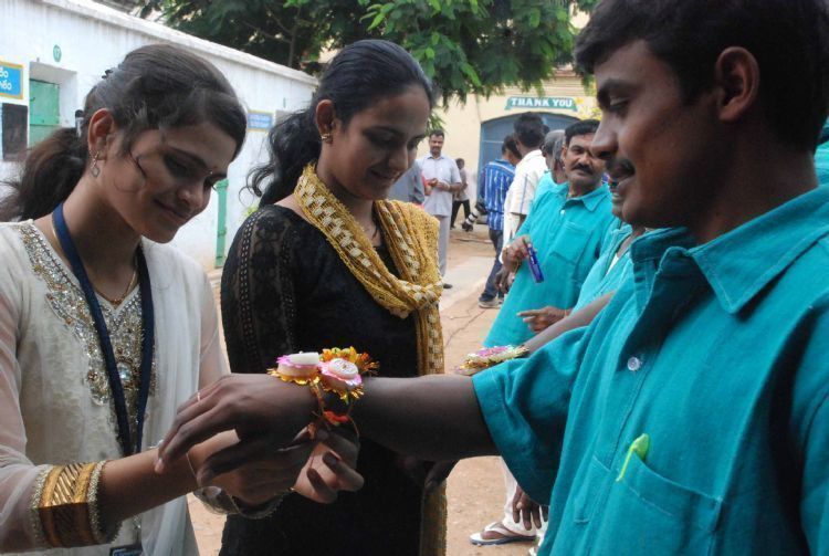 Students of St Francis College tie Rakhis to policemen and prisoners at Chanchalguda Central Prison on the occasion of Raksha Bandhan here on Thursday - INN Photos
