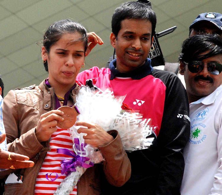 Saina Nehwal gets rousing welcome as she returns home with her Olympic bronze medal at Shamshabad Airport here on Tuesday - INN Photos