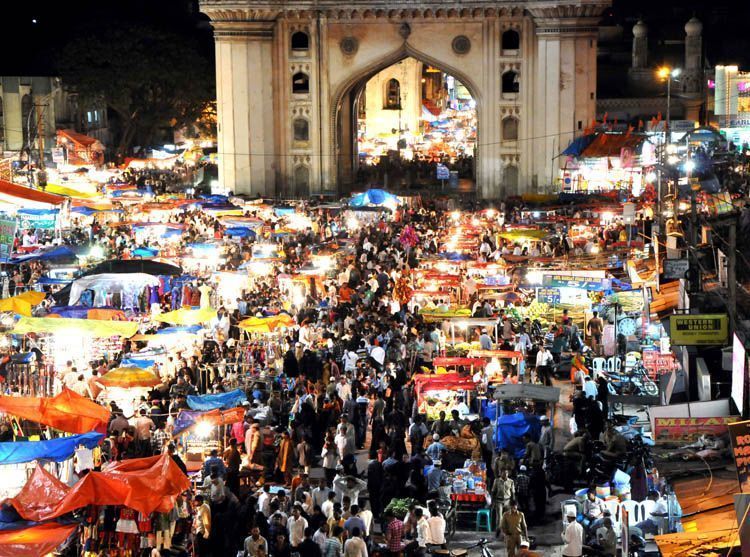 Dazzling night bazaar bursting at seams with shoppers on the last day of the holy month of Ramazan near Charminar in the old city of Hyderabad on Sunday.