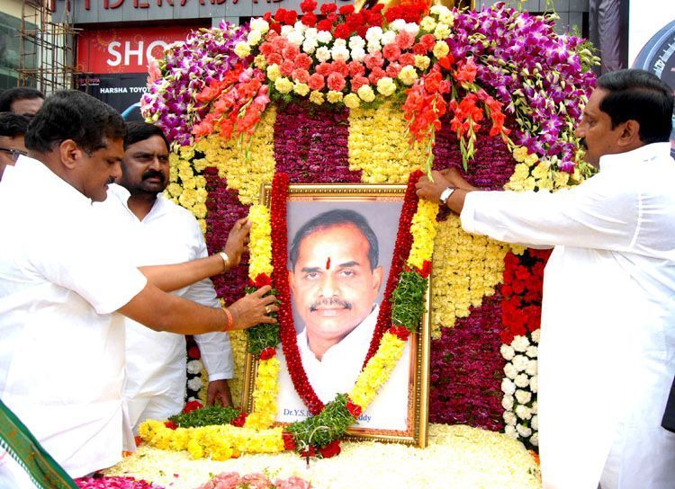 Chief Minister N Kiran Kumar Reddy, PCC president Botsa Satyanarayana and other leaders pay floral tributes to former CM YS Rajasekhara Reddy at his statue at Panjagutta crossroads on his 3rd death anniversary here on Sunday - INN Photos