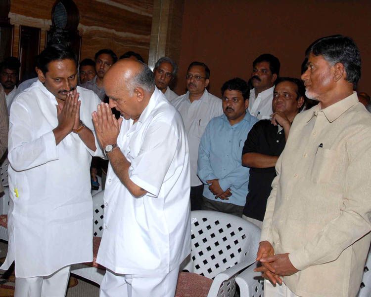 Chief Minister N.Kiran Kumar Reddy shares his grief with Ramoji Rao before placing a wreath on the body of Suman at Ramoji Film City on Friday.