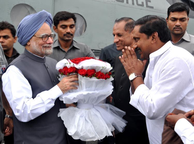 Governor ESL Narasimhan, Chief Minister N.Kiran Kumar Reddy receiving Prime Minister Manmohan Singh at SHAR center in Sriharikota on Saturday. Singh will witness the launch of PSLV C-21, scheduled Sunday.