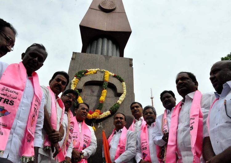 TRS MLAs offer floral tributes to Telangana Martyrs at Gun Park here on Monday - INN Photos