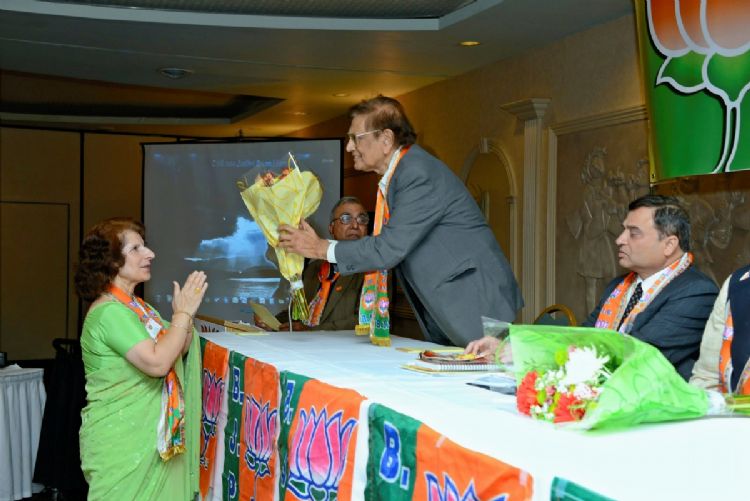 Overseas Friends of BJP's Nationcal Council Meeting was held in North Brunswick, NJ from September 14th to 16th. Attendees include Shri Ram Lal Gupta, National General Secretary (Org), BJP, Shri Vijay Jolly, Overseas Convener of the foreign affairs cell, BJP and Gajendra Solanki, Co-convenor, Cultural Cell, BJP. Photocredit: Shivakumar Chikine