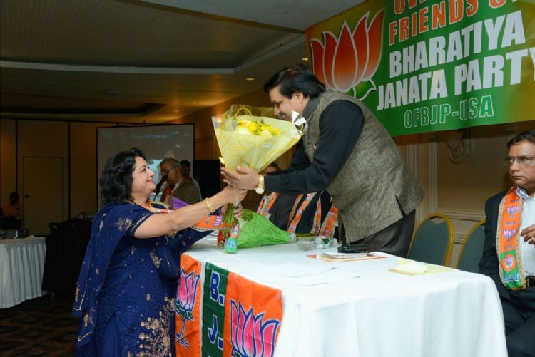 Overseas Friends of BJP's Nationcal Council Meeting was held in North Brunswick, NJ from September 14th to 16th. Attendees include Shri Ram Lal Gupta, National General Secretary (Org), BJP, Shri Vijay Jolly, Overseas Convener of the foreign affairs cell, BJP and Gajendra Solanki, Co-convenor, Cultural Cell, BJP. Photocredit: Shivakumar Chikine