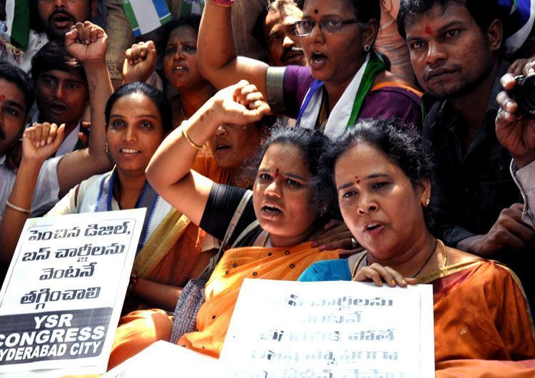 YSR Congress party activists stage dharna before Hyderabad Collectorate at Abids here on Wednesday in protest against the hike in bus fares - INN Photos