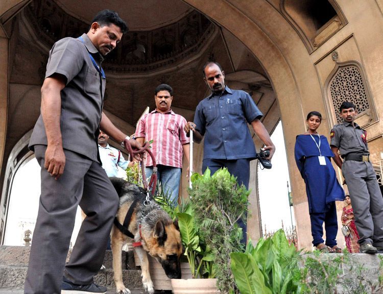 Personnel of Bomb Squad performing the security check at Charminar here on Friday in view of annual Ganesh procession to be held on Saturday - INN Photos