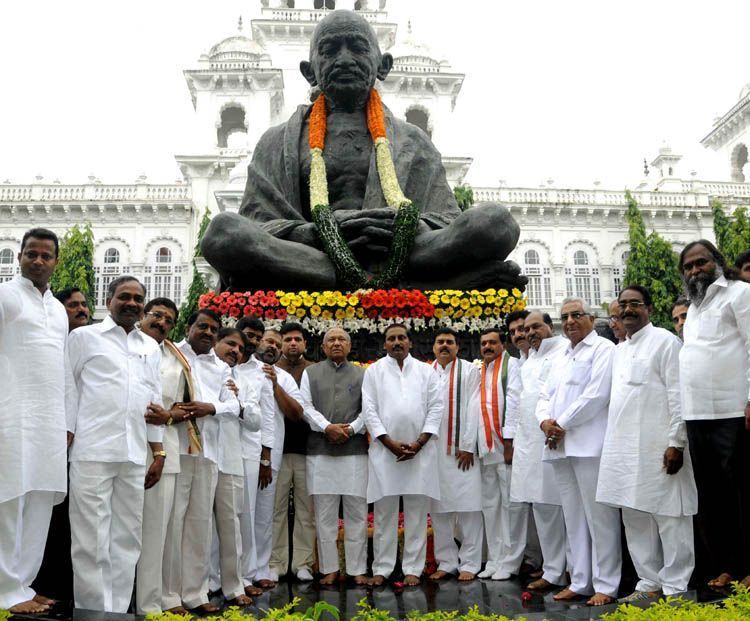 Chief Minister N Kiran Kumar Reddy, Speaker Nadendla Manohar and other leaders pay tributes to Mahatma Gandhi at his statue in the Assembly premises here on Tuesday - INN Photos