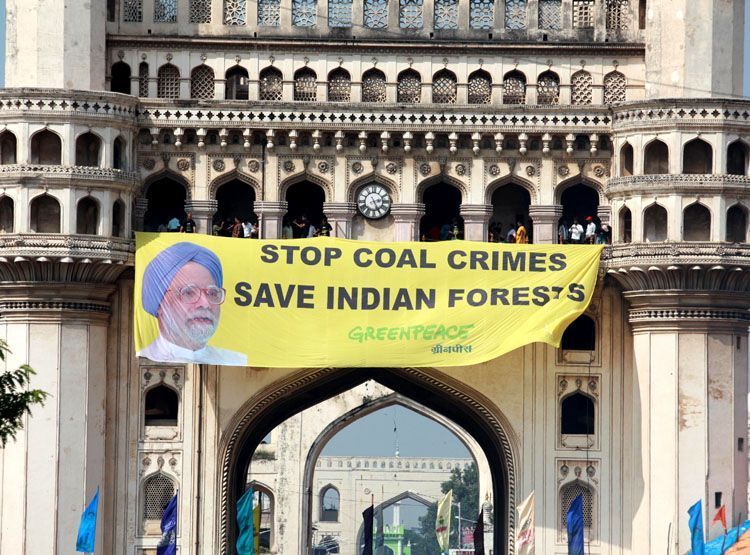 Animal Rights activist Amala Akkineni joins the Greenpeace protest at historic Charminar here by unfurling a banner on the monument on Monday demanding protection of forests from coal mining - INN Photos