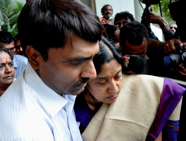 Suspended senior IAS officer Y Srilakshmi being helped out by her IPS husband Gopi Krishna while coming out of Women's Prison at Chachalguda here on Tuesday - INN Photos