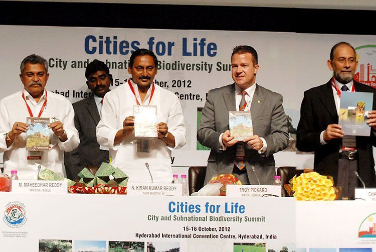Chief Minister N Kiran Kumar Reddy, Municipal minister Maheedhar Reddy and others at the launch of 'Cities for Life Summit' at the HICC here on Monday - INN Photos