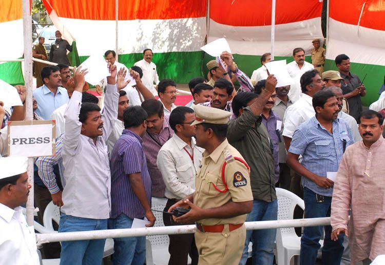 Journalists seen protesting against the discriminatory attitude of police against Telangana journalist during the global biodiversity meet at the launch event of Congress party's membership drive at Gandhi Bhavan here on Thursday.- INN Photos