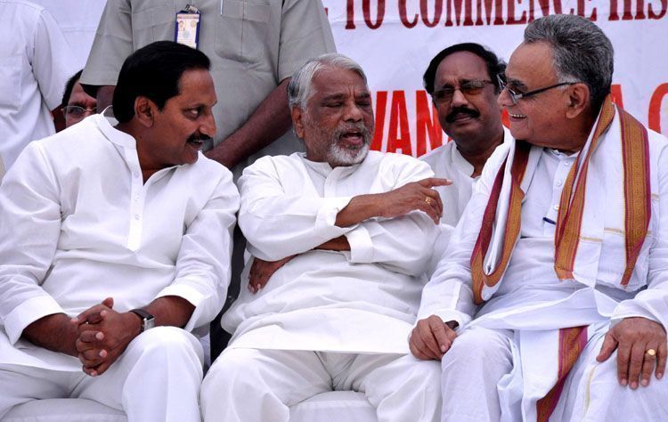 Chief Minister N Kiran Kumar engrossed in a pep talk with other senior leaders of the party while participating in the Rajiv Gandhi Sadbhavana Yatra Commemoration Day function at Charminar here on Friday - INN Photos