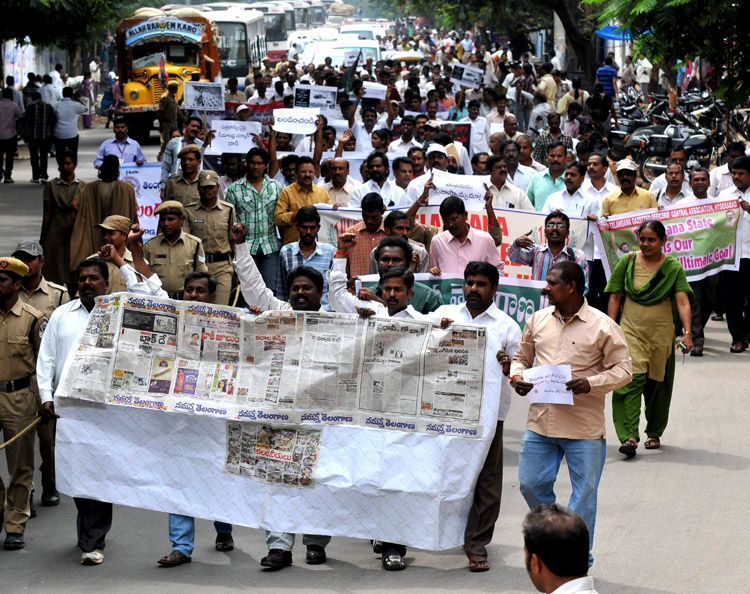 Telangana Journalists take out rally from Baghlingampally to Indira Park here on Tuesday in protest against State Government's discriminatory attitude towards Telangana Journalists during the recently held global Bio-Diversity Meet - INN Photos
