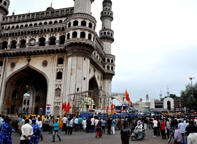 Tension prevailed at Charminar when members of one community objected to the renovation of Bhagya Laxmi Temple. Ordering status quo, police stopped the construction of temple's shed and also took a few people into custody - INN Photos
