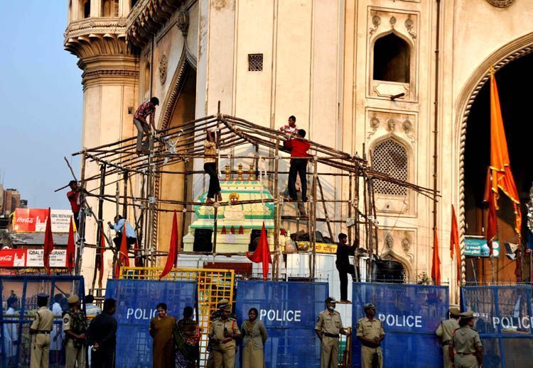 Police forces take control of Old City roads and lanes following tension over alleged expansion of Bhagyanagar Temple abutting Charminar here on Sunday - INN Photos