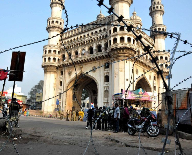 Police forces take control of Old City roads and lanes following tension over alleged expansion of Bhagyanagar Temple abutting Charminar here on Sunday - INN Photos